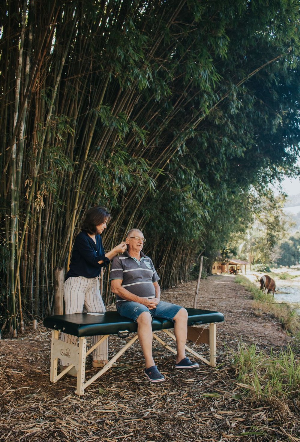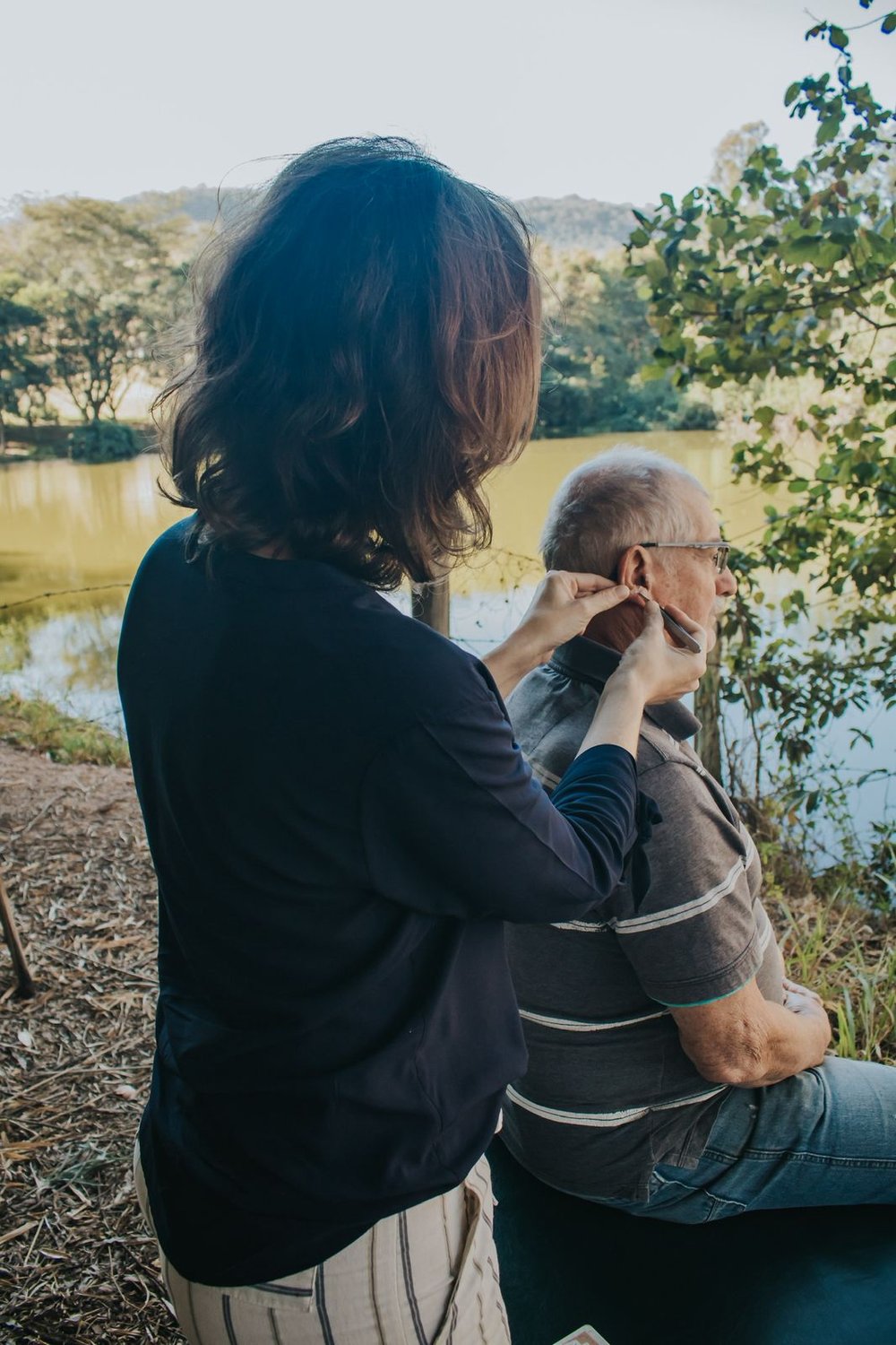 Vivência de banho de natureza com práticas de respiração consciente, interação com a água e sessão individual de auriculoterapia. Um momento de entrega e reconexão.