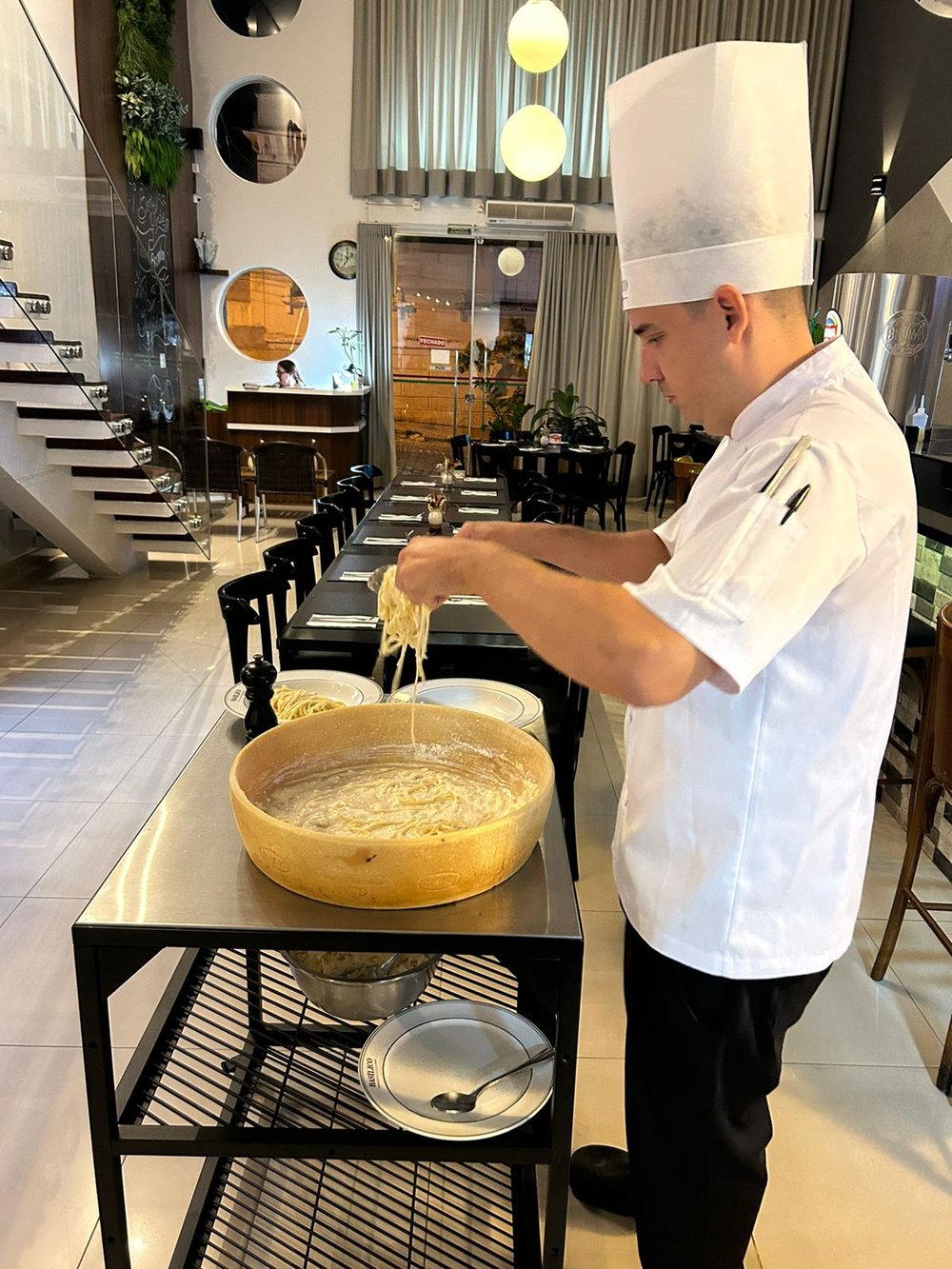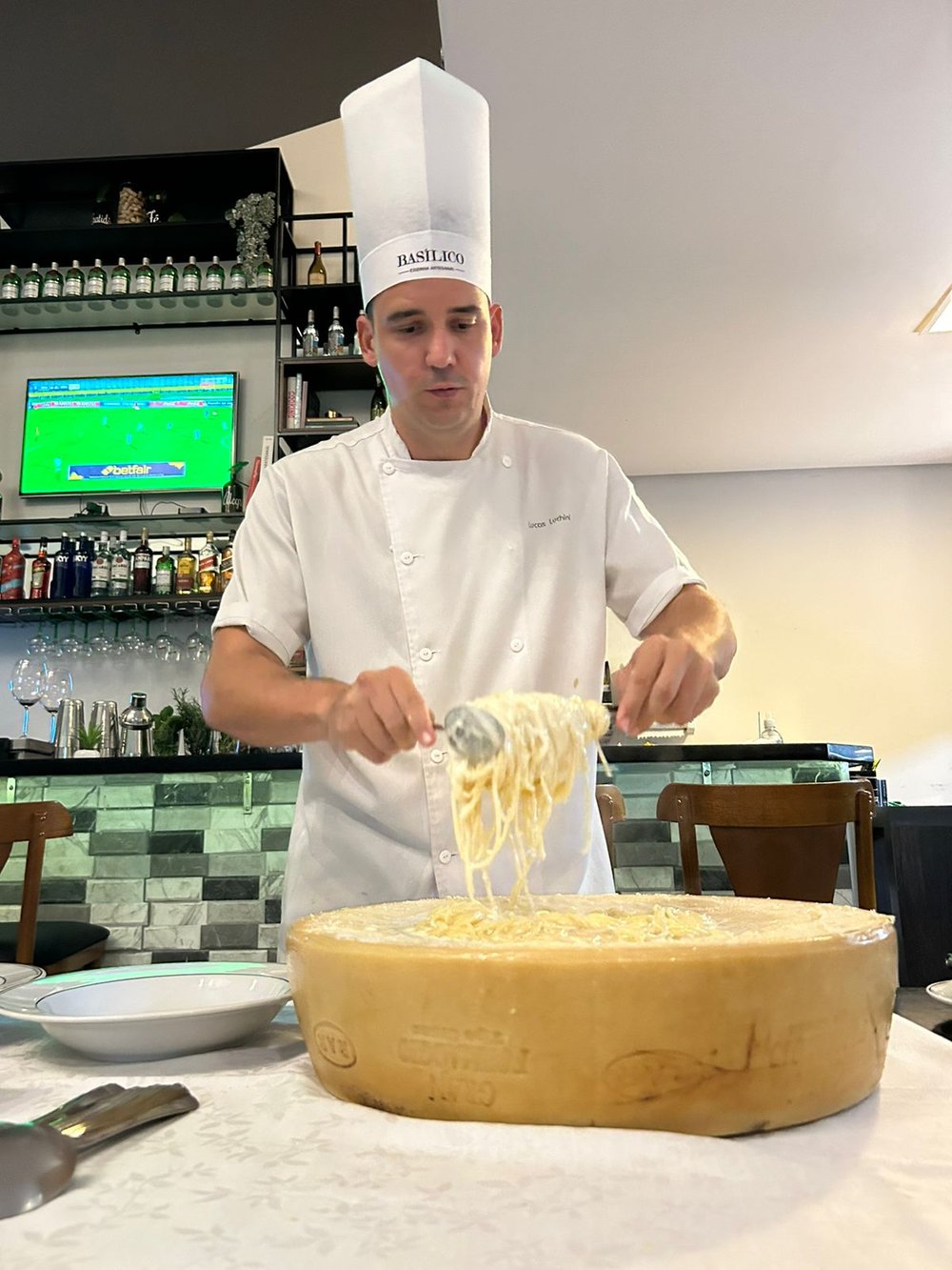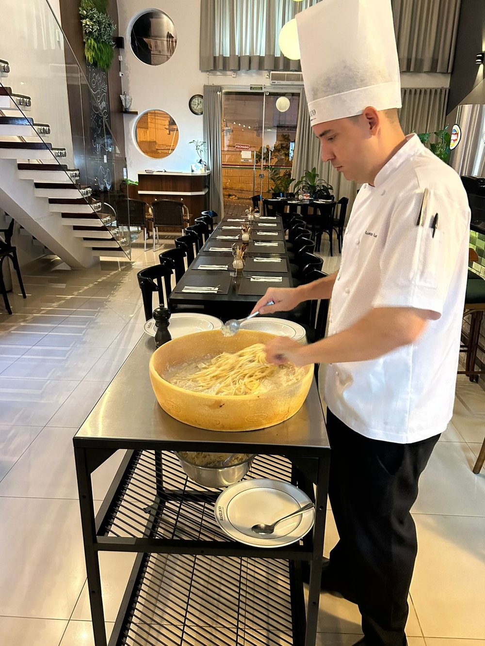 Imagine a massa sendo preparada dentro do Grana Padano, onde o calor do queijo derrete suavemente os sabores, criando uma combinação de texturas e gostos irresistíveis. A apresentação é de tirar o fôlego, fazendo com que cada garfada seja um momento de pura satisfação.